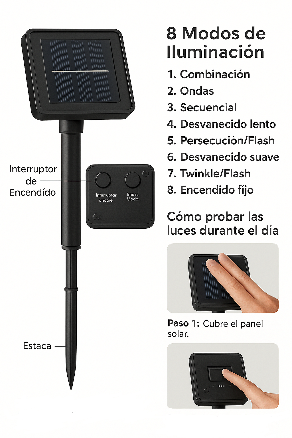 Tip: Si las luces no encienden, coloca el panel solar al sol por 1–2 días.